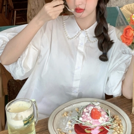 [CD428]와이드 퍼프 진주 뒤트임 블라우스