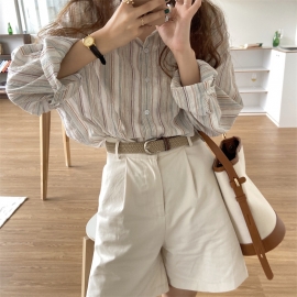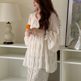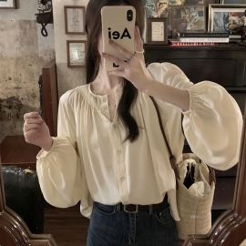 [CD868]무디 셔링 콩단추 벌룬 블라우스